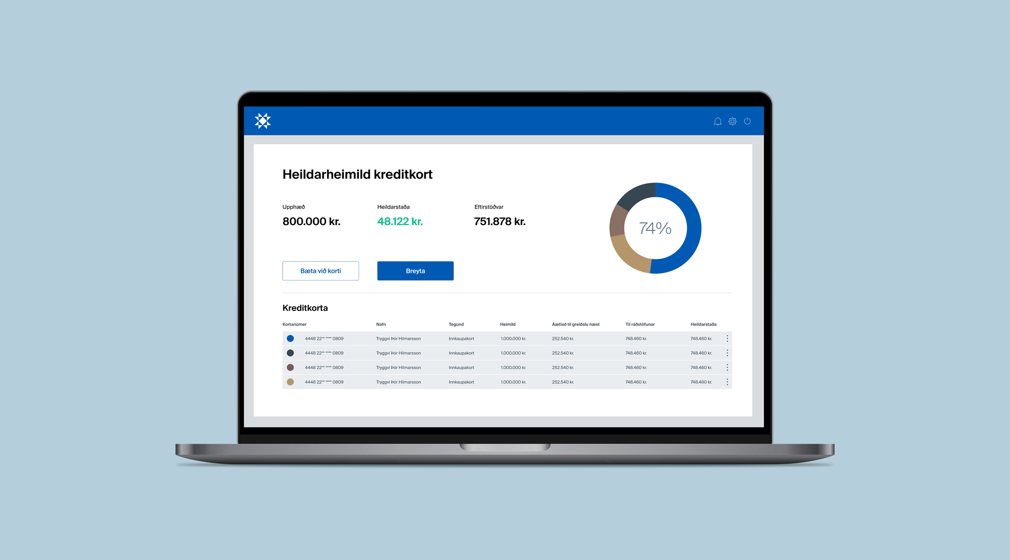 Lykilnotendur fyrirtækja geta óskað eftir stofnun eða breytingu á heildarheimild kreditkorta undir Kreditkort á vinstri valmynd netbankans. Samþykktar umsóknir þarf í framhaldi að undirrita rafrænt af firma fyrirtækis.