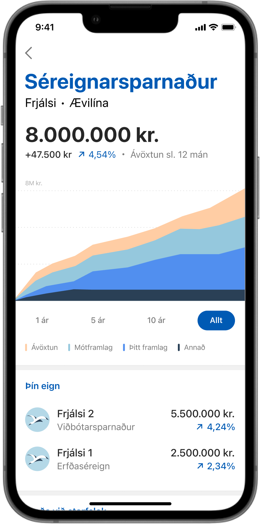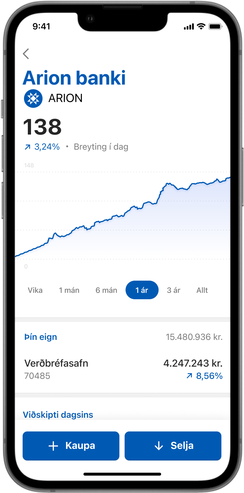 Í Arion appinu finnur þú stöðu allra þinna eigna á einum og sama stað, auk línurits sem sýnir ávöxtun og hreyfingaryfirlit.