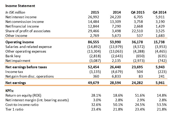 Earnings from regular operations amounted to ISK 16.8 billion, compared with ISK 12.7 billion in 2014. Return on equity from regular operations was 10.4%, compared with 10.7% in 2014. Total assets at the end of 2015 amounted to ISK 1,011.0 billion, compared with ISK 933.7 billion at the end of 2014. Shareholders’ equity totalled ISK 192.8 billion at the end of 2015, a 20% increase from the previous year.