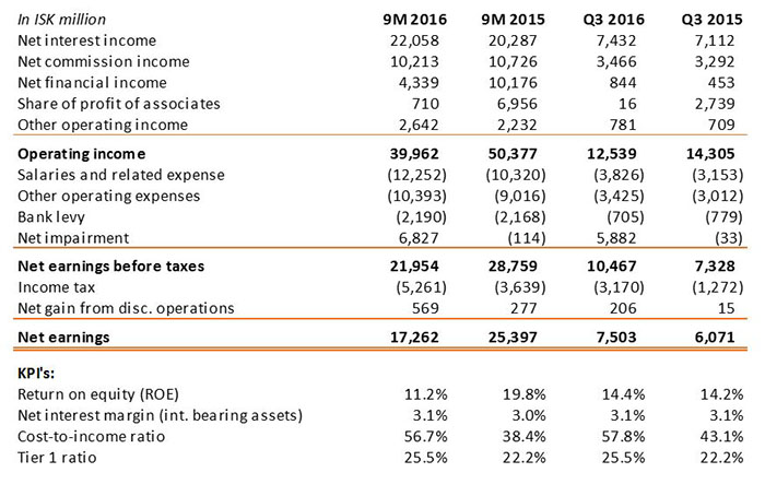 Arion Bank reported net earnings of ISK 17.3 billion for the first nine months of 2016, compared with ISK 25.4 billion for the same period of 2015. Return on equity was 11.2%, compared with 19.8% for the first nine months of 2015. Adjusted earnings amounted to ISK 5.7 billion, compared with ISK 11.5 billion in the first nine months of 2015. Return on equity from adjusted operations was 3.7%, compared with 9.5% for the same period last year.