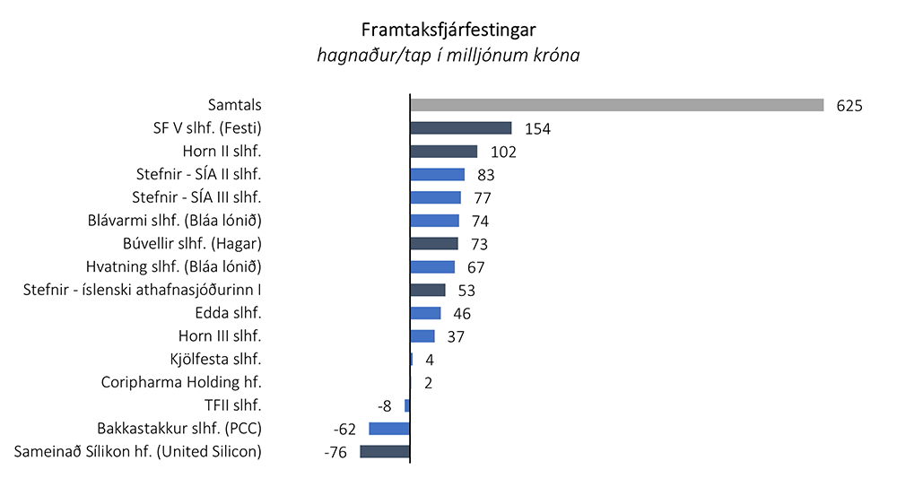 Frá árinu 2011 hefur eignaflokkurinn, innlendar sérhæfðar fjárfestingar í heild sinni, skilað um 1.858 milljón króna hagnaði af heildarfjárfestingu upp á um 3.845 milljónir króna. Í texta og myndum hér fyrir neðan má sjá árangur einstakra fjárfestinga sem eru nýhafnar (ljós bláar súlur), komnar langt á veg (bláar súlur) eða er lokið (dökk gráar súlur).