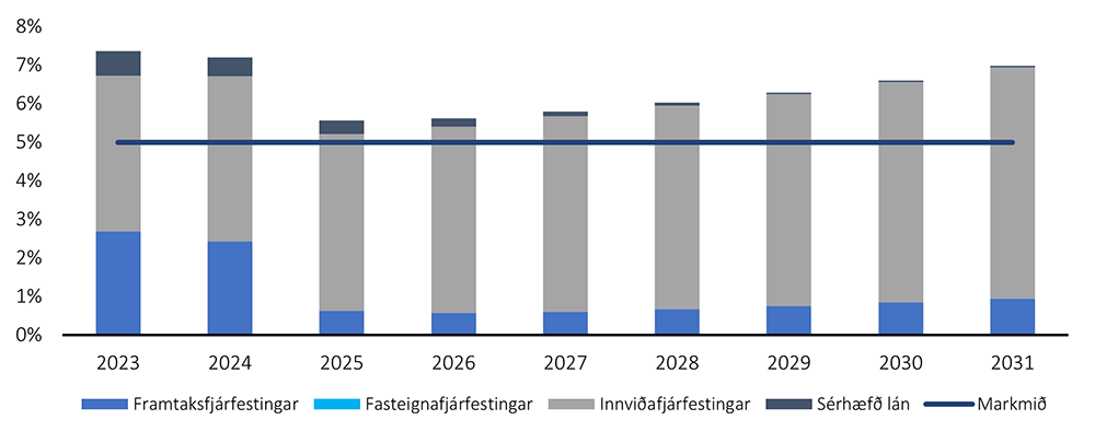 Í tilviki LSBÍ þar sem að lífeyrisgreiðslur eru hærri en iðgjöld þá er mikilvægt að vera með áhættuminni og auðseljanlegar eignir í safninu. Síðustu misseri hefur verið dregið úr fjárfestingum í innlendum sérhæfðum fjárfestingum þar sem þær fela almennt í sér lengri binditíma, eru tregseljanlegri og rekstrartími þeirra getur orðið vel yfir áratug. Markmið sjóðsins í innlendum sérhæfðum fjárfestingum er 5% af eignasafni en núverandi staða er yfir því marki sem má að stórum hluta skýra vegna góðrar ávöxtunar í innviðafjárfestingum sem sjóðurinn hefur tekið þátt í.