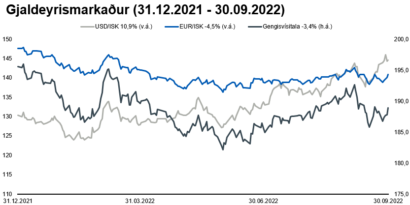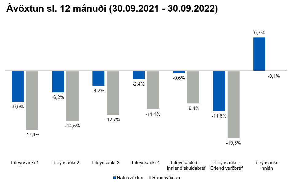 Mikil lækkun hefur verið á innlendum hlutabréfamarkaði það sem af er ári. OMXI10, úrvalsvísitala íslenska markaðsins, lækkaði um 27,3% á fyrstu níu mánuðum ársins. Innlend félög lækkuðu verulega eftir innrás Rússa í Úkraínu þann 24. febrúar. Verðbólga mældist 9,9% í júlí, en síðustu tvær mælingar (9,7% í ágúst og 9,3% í september) benda til þess að ákveðnum toppi hafi verið náð. Til þess að bregðast við hærri verðbólgu hefur Seðlabanki Íslands hækkað stýrivexti á árinu um 3,75 prósentustig og standa þeir nú í 5,75% en seðlabankastjóri sagði á síðasta fundi peningastefnunefndar 5. október sl. að vaxta hækkanir hafi skilað árangri og peningastefnunefnd voni að þetta verði síðasta vaxtahækkun Seðlabankans í þessu ferli. Þessi mikla verðbólga, hækkun stýrivaxta, ásamt fylgni við erlenda hlutabréfamarkaði er meginástæða þeirrar lækkunar sem við sjáum á íslenska hlutabréfamarkaðnum. Ávöxtunarkrafa bæði óverðtryggðra og verðtryggðra innlendra ríkisskuldabréfa hefur hækkað á árinu sem hefur neikvæð áhrif á verð þeirra bréfa. Skuldabréfasöfn Lífeyrisauka eru að mestu verðtryggð en vægi verðtryggðra skuldabréfa af innlendu skuldabréfasafni Lífeyrisauka var um 88% í lok september.