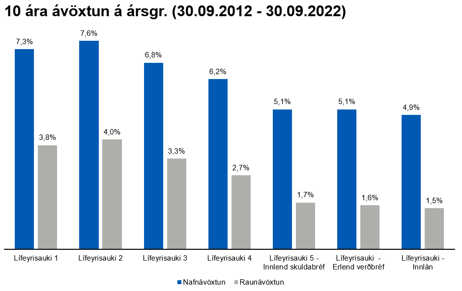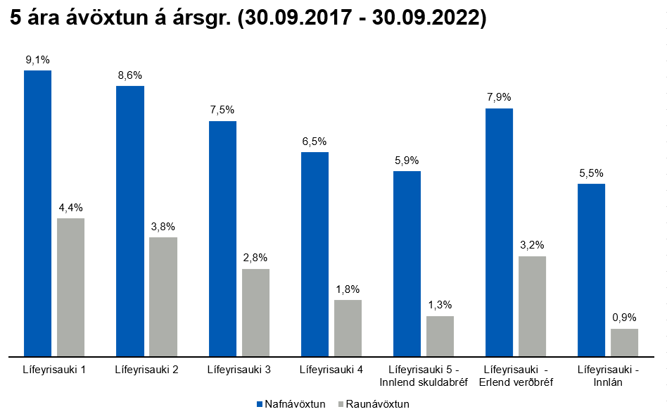 Ávöxtun síðustu ára hefur verið afar góð en árið 2021 var með þeim bestu frá upphafi sjóðsins. Nafnávöxtun Lífeyrisauka 1 var t.a.m. 21% og ávöxtun Lífeyrisauka 2 var 19,2% en þá var innlendi hlutabréfamarkaðurinn mjög kraftmikill. Ávöxtun lífeyrissjóða er í eðli sínu háð markaðsaðstæðum hverju sinni, til skamms tíma getur ávöxtunin verið sveiflukennd en það sem skiptir mestu máli er að raunávöxtun til langs tíma sé jákvæð. Á þessari stundu siglum við í ólgusjó sveiflna á fjármálamörkuðum og þ.a.l. hefur nafnávöxtun sjóða Lífeyrisauka verið lakari en undanfarin ár. Verðbólgan bætir síðan gráu ofan á svart og bítur mikið á raunávöxtun sjóðsins. Þegar markaðir hafa lækkað mikið geta myndast tækifæri sem hægt er að nýta sér, það á sér t.d. stað þegar góð félög hafa verið undirverðlögð. Langtímaávöxtun sjóðsins hefur verið góð en á myndunum hér fyrir neðan má sjá meðalávöxtun Lífeyrisauka til 5 og 10 ára m.v. 30. September 2022 ásamt ávöxtun sjóðsins frá áramótum. Nafnávöxtun Lífeyrisauka 1 til 5 ára á ársgrundvelli hefur t.a.m. verið 9,2% og raunávöxtun 4,2%.
