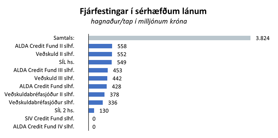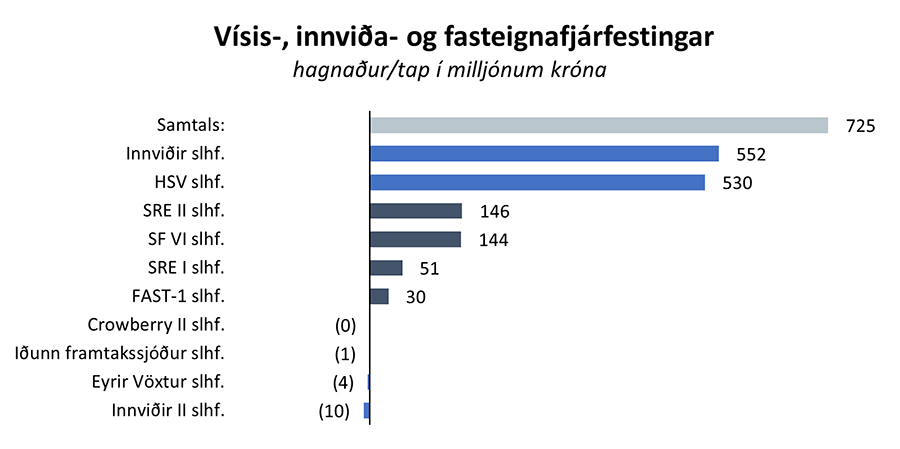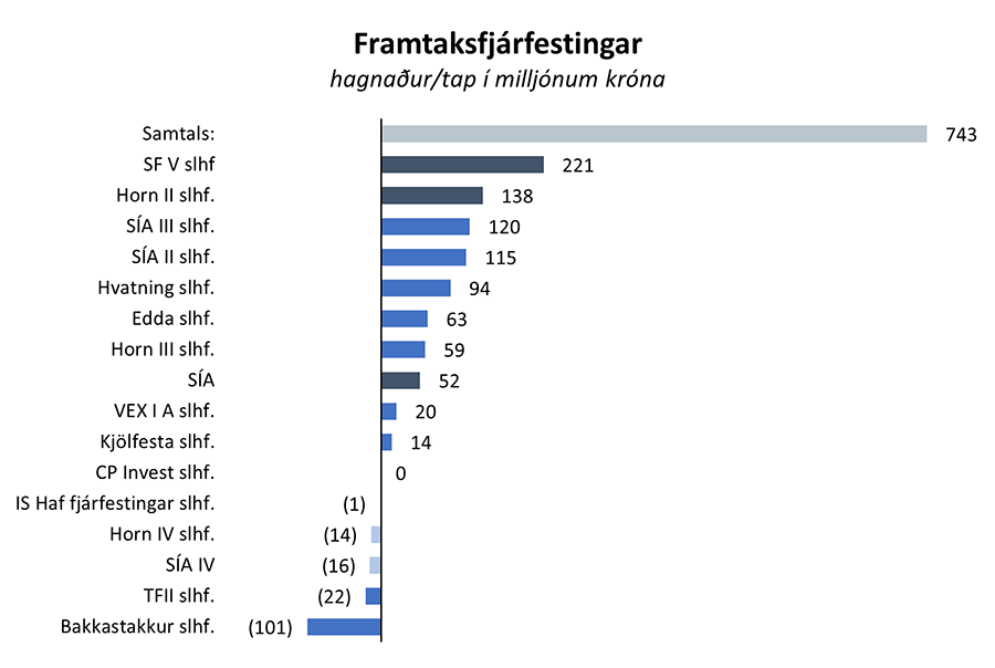 Frá árinu 2011 hefur eignaflokkurinn, innlendar sérhæfðar fjárfestingar í heild sinni, skilað um 2.067 milljón króna hagnaði af heildarfjárfestingu upp á um 6.493 milljónir króna. Í texta og myndum hér að neðan má sjá árangur einstakra fjárfestinga sem eru nýhafnar (ljósbláar súlur), komnar langt á veg (bláar súlur) eða er lokið (dökkgráar súlur).