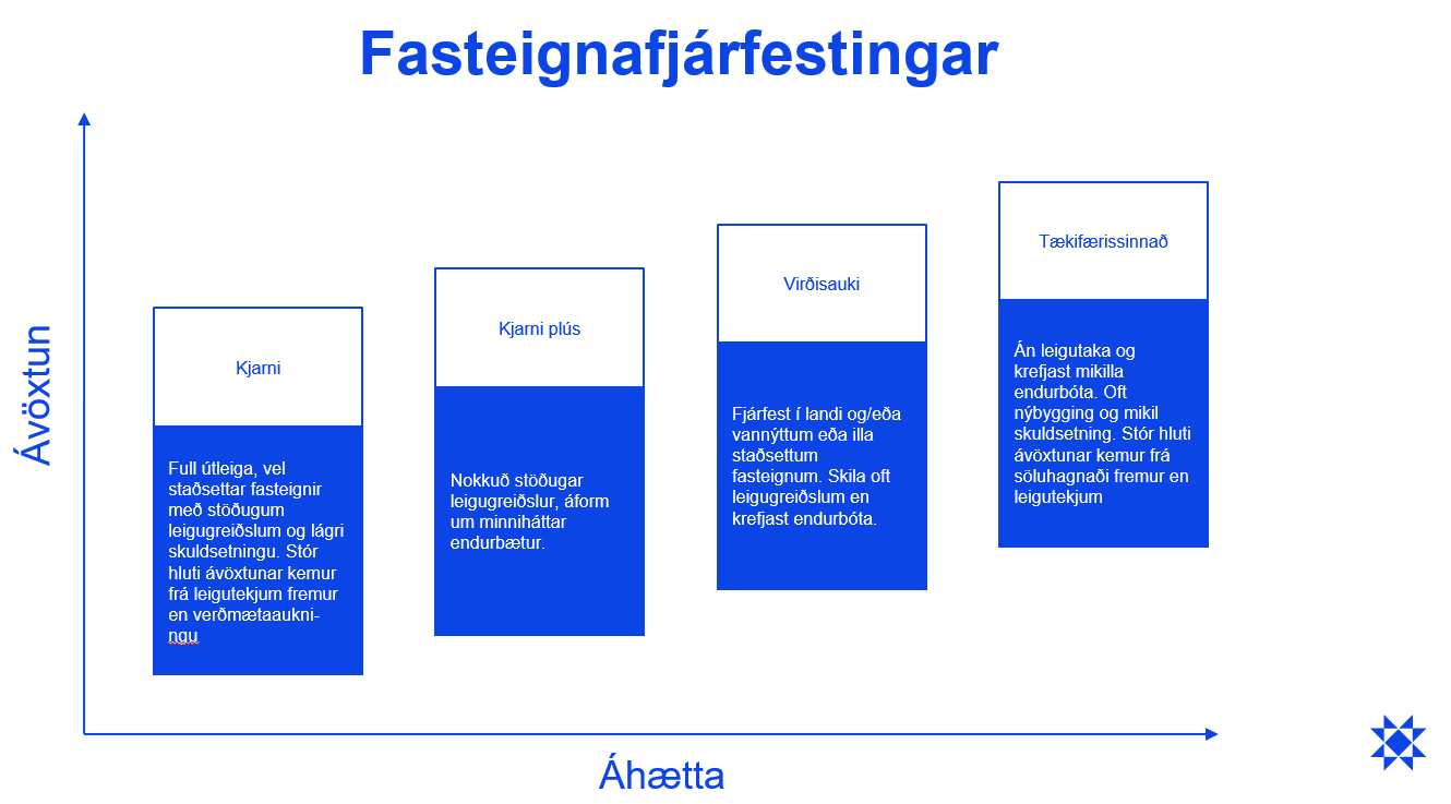 Fasteignafjárfestingar (e. Real estate) eru fjárfestingar í íbúðar- og/eða atvinnuhúsnæði þar sem markmiðið er að hámarka tekjur af fasteigninni á eignartímabilinu og þar með verðmæti hennar. Tekjur geta komið frá endursölu fasteigna eða í gegnum fyrirsjáanlega leigu. Þegar tekjurnar eru í formi fyrirsjáanlegrar leigu er áhættan og vænt ávöxtun að jafnaði minni en þegar tekjurnar koma frá endursölu. Kjarnahluti Lífeyrisauka samanstendur af kjarna og kjarna plús fjárfestingum en kryddhluti eignasafnsins eru svokallaðar virðisauka og tækifærissinnaðar fjárfestingar.