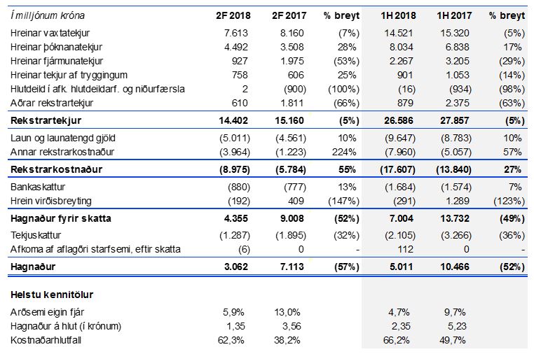 „Afkoma bankans á öðrum ársfjórðungi 2018 er í takt við væntingar eftir fremur erfiðan fyrsta ársfjórðung. Góður vöxtur var í hefðbundinni starfsemi bankans og jukust lán til viðskiptavina um 5% á fyrstu sex mánuðum ársins. Vaxtamunur á vaxtaberandi eignir hækkaði í 2,8% á öðrum fjórðungi úr 2,6% á þeim fyrsta og þóknanatekjur jukust um rúmlega fjórðung og tekjur af tryggingastarfsemi meira en fjórfölduðust borið saman við fyrsta ársfjórðung. Efnahagur bankans er sem fyrr sterkur sem gerir bankann vel í stakk búinn til að þjónusta sína viðskiptavini, jafnt fyrirtæki sem einstaklinga.