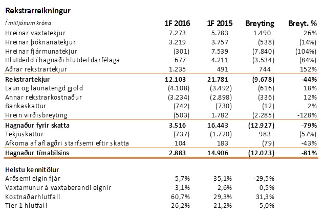 Hagnaður af reglulegri starfsemi nam 2,6 milljörðum króna samanborið við 4,0 milljarða á fyrsta ársfjórðungi 2015. Arðsemi eigin fjár af reglulegri starfsemi nam 5,1% samanborið við 9,8% á fyrsta ársfjórðungi 2015. Heildareignir námu 1.028,6 milljörðum króna í lok mars samanborið við 1.011,0 milljarða króna í árslok 2015 og eigið fé hluthafa bankans nam 195,2 milljörðum króna í lok mars, samanborið við 192,8 milljarða króna í árslok 2015.