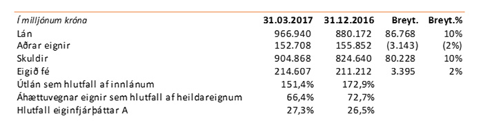 Eiginfjárhlutfall bankans var 28,0% í lok mars en var 27,1% í árslok 2016. Hlutfall eiginfjárþáttar A hækkaði og nam 27,3% samanborið við 26,5% í árslok 2016.