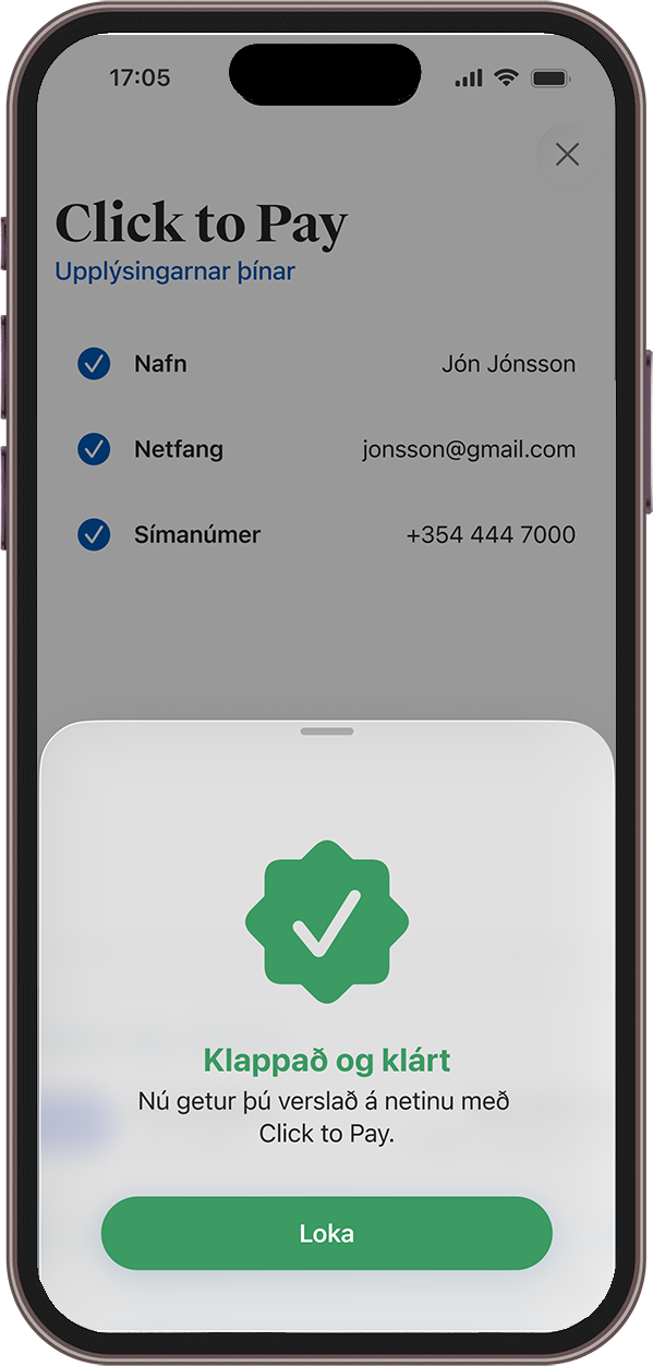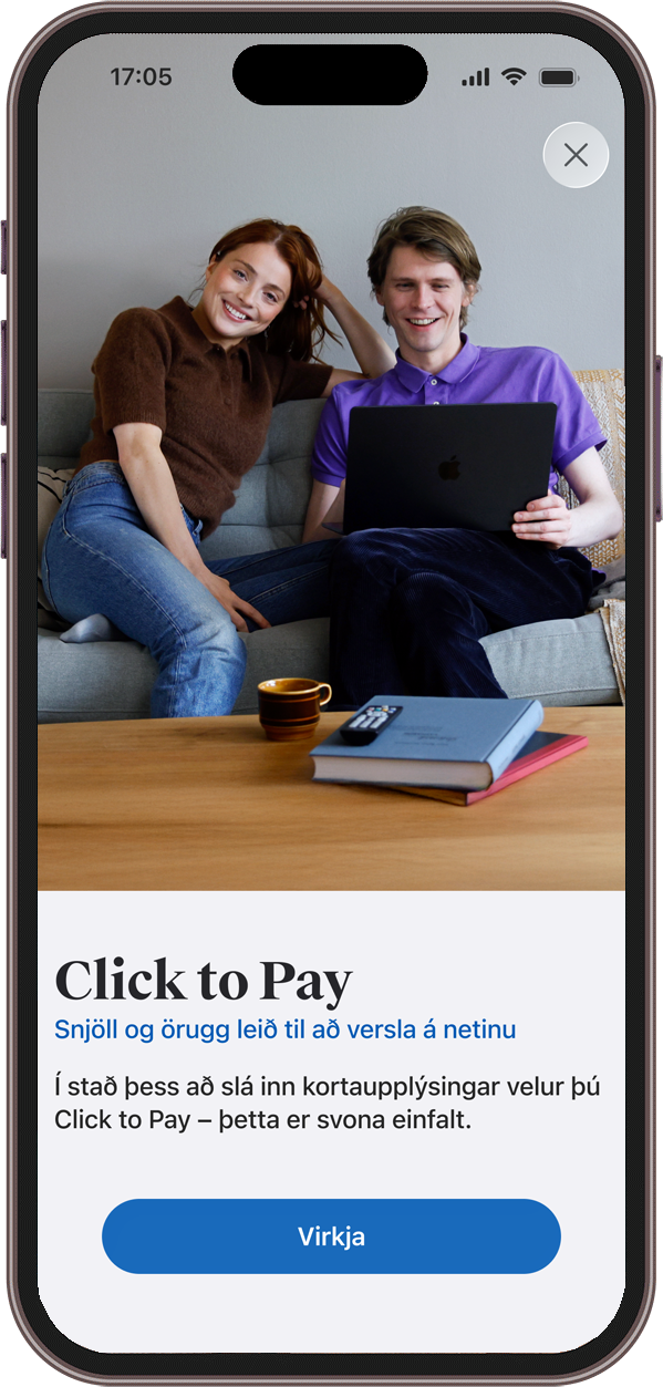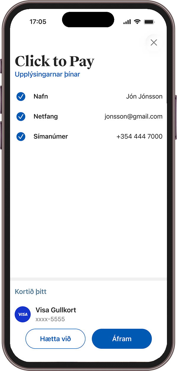 Þegar þú notar Click to Pay þegar þú verslar á netinu sleppur þú við að slá inn viðkvæmar upplýsingar eins og kortanúmer, öryggisnúmer og gildistíma. Þess í stað velur þú að greiða með Click to Pay og klárar greiðsluna þannig.